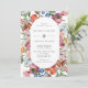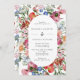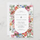 Um convite de casamento colorido, com cor d'água multicolor, Mestrados holandeses estilo flores vivas ao redor de uma trendy pill frame, sobre fundo branco. O reverso apresenta um pedaço de flores.