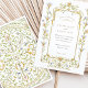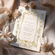 Este luxuoso convite para o casamento apresenta uma bela moldura ao estilo do Rococo adornada com delicadas flores de aquarelas em azul macio, azul de córnfo, amarelo-manteiga e verde-sábio. Inspirada pela arte ornamental do século 18, a design apresenta uma intrincada obra de ouro entrelaçada com bordas florais verticais e uma crista floral floral florescente no topo e no fundo. O design pintado à mão espelha a grandeza dos tetos de palácio antigos, recheados de videiras giratórias e flores estilizadas numa composição circular em forma de mandala. A tipografia está sabiamente subestimada nas fontes de serifa e guião castanho macio, equilibrando elegância clássica com encanto artístico. Ideal para casamentos formais com um tema romântico, histórico ou inspirado na Europa.