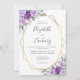 Este elegante convite de casamento moderno apresenta buquês florais de cor d'água roxa, acentuados com o eucalipto verde em dois cantos em um fundo branco. O texto personalizável, rodeado por uma estrutura geométrica de folha de alumínio dourada, combina cinzas de carvão com escrita manuscrita, placa de cobre e fontes itálicas. O verso é branco sólido.