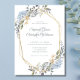 Convites de casamento com moldura geométrica dourada e florais e folhas em azul empoeirado em aquarela romântica. Adicione os detalhes do seu casamento a este convite de coroa botânica moderna. Este design elegante é ideal para casamentos de primavera e verão.
