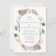 Elegantes convites para casamentos florais com seus nomes e detalhes de casamento cercados por um quadro oval de rosas brancas cremosas, orquídeas cor-de-rosa-pincel-pincel e folhas e folhagem verdes. Os convites de casamento românticos são perfeitos para casamentos de primavera e verão. Projetado para coordenar com nossa coleção de casamento de Rosas de Aquarela e Orquídeas.