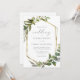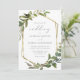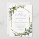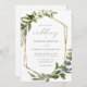 Este elegante convite de casamento rústico apresenta uma estrutura geométrica de folha falsa de ouro decorada com eucalipto verde. A palavra "casamento" aparece em escrita caligráfica. Personalize o texto da cinza de carvão com os nomes da noiva e do noivo e os detalhes do casamento na frente, e suas iniciais e URL do site no verso.