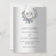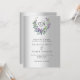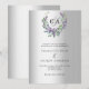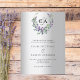 Um fundo de olhar mal prateado. Uma coroa floral feita de flores lavandas e de eucalipto verde de cor aquosa. Personalize e adicione suas iniciais, nomes e detalhes do monograma. Texto preto.