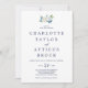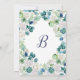 Este clássico convite de casamento de monograma de flores brancas é perfeito para um casamento de primavera. O elegante design floral apresenta marfim macio e rosas brancas e peônias com toques de flores azuis-rosadas-periwinkle e folhagem verde.