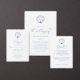Este convite de casamento de praia azul-chic costeira minimalista moderno tem uma casca de couro cabeludo com as iniciais monográficas da noiva e do noivo no topo, e a caligrafia elegante com guião.