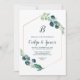 Este magro cartão de convite de casamento geométrico de ouro rosa verde é perfeito para um casamento elegante no quintal. O design botânico moderno apresenta um belo eucalipto azul-aquarela e folhas verdes com uma simples estrutura geométrica rosa-dourada.