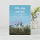 Cartão de convite de casamento para o tema da montanha russa, com ilustração de uma montanha azul com floresta de pinheiros. O céu é azul e rosa.