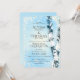 Luzes brilhantes da noite brilham ao redor das bruxelas brancas rústicas neste convite de casamento elegante e rústico em azul-céu com luzes brilhantes do ouro.
