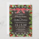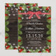 Convites de casamento de inverno com um fundo de madeira escura rústica, folhagem verde de Natal, enfeites de árvore vermelhos, luzes cintilantes, uma fita xadrez e um modelo de celebração festiva que é fácil de personalizar.