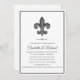 Convites de casamento de fêmur de lis, modernos, com fundo branco e cinza de prata, pulsos de lis crest. O texto é cinza escura. Estas são a solução perfeita para casamentos de fêmur de lis e elegante francês!