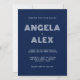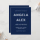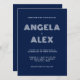 Um marinho escuro, azul e branco minimalista de arte deco retro geométrico informações de casamento convite para noiva e noiva. Dependendo dos nomes dos casais, você pode diminuir o tamanho da fonte. Altere o fundo e as cores da fonte para corresponder à paleta de cores do casamento.