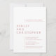 Um convite de casamento minimalista, elegantemente simples, com tipografia limpa e uma ousada composição moderna. Design apresenta detalhes do casamento alinhados em margens deslocadas, destacando os nomes dos casais como um bloco de texto isolado. O design é despojado de ornamentação externa, dando assim prioridade à funcionalidade, equilíbrio e harmonia. Perfeito para casais que abraçam a maior simplicidade, elegância e estilo. A parte traseira da placa é vazio esquerdo, com um fundo de cor sólida. O design está disponível em uma seleção curada de cores modernas e é facilmente personalizado. Compartilhe um comentário e procure assistência na personalização ou em qualquer personalização. Aguardamos com expectativa a notícia e o trabalho consigo!