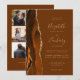 A borda esquerda deste elegante convite de casamento moderno apresenta uma laranja queimada e uma aquarela ferrugem borda agitada com falsa brilho de ouro. O texto personalizável combina manuscritos dourados, copperplate e fontes itálicas em um fundo marrom noz. O verso fornece espaços para 5 fotos (3 horizontais 1 quadrado e 1 vertical) e espaço para o seu site de casamento URL ou outra mensagem breve.