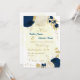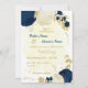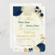 Flores azuis e brancas-marinhos românticas com folhas de ouro convite de casamento botânico Os detalhes da brilha são simulados. É adequado para casamento e festas de noivado.