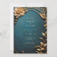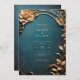 Descubra a beleza do seu amor com este Dourado e Azul Convite para Casamento. Apresentando um fundo azul ornamental texturizado adornado com decor metálico ouro em efeito 3D, este convite irradia sofisticação e charme. Personalize para capturar a essência do seu dia especial.