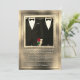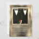Convite de casamento de ouro e gay com o casal com uma rosa vermelha.