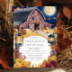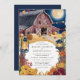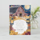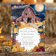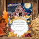 Capture a essência de uma noite mágica de outono com este convite de casamento rústico, com um céu azul marinho, lua de cheio brilhante, e um charmoso celeiro iluminado por lanternas e luzes de cordas. As matizes quentes das flores de outono e das abóboras contrastam lindamente contra o fundo profundo, criando uma atmosfera acolhedora e convidativa. Perfeito para um casamento no interior sob as estrelas, esta design combina o encanto rústico de uma fazenda com a elegância de uma celebração noturna.