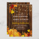 Um convite de casamento de noiva de outono, perfeito para o outono. Apresenta um fundo de madeira escuro com duas abóboras brilhantes, um confete com brilho dourado, e luzes de fadas brilhantes para um toque romântico. As folhas do outono em laranja, amarelo e marrom ricos adicionam uma vibração sazonal acolhedora. O modelo do casamento é fácil de personalizar, fazer ideal para capturar sua celebração do outono.