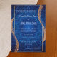 Um fundo azul Marinho escuro é preenchido com um design do tipo mandalla radiante em azul-paler. A placa é decorada com uma moldura de ouro amarelo hetero e uma espiral de brilho dourado rosa. O texto do seu convite para o casamento é uma formulação tradicional apresentada num azul pálido, quase branco. As fontes modernas contrastantes apresentam os nomes de ambos os conjuntos de pais. Sugerimos discutir com seus pais como eles desejam que seus nomes sejam impressos.