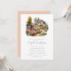 Este convite apresenta uma pintura de paisagem aquática de jardim aconchegante na primavera, com flores florescendo ao lado de uma cerca de piquete e um caminho de pedra passando por uma pequena cabana ou galpão. O nome do casal aparece no script de escrita manual moderno, com o resto do texto na fonte sans serif. A parte de trás do cartão é uma sombra coordenadora de terracota sólida pálida. Ideal para um casamento na primavera.