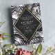 Este convite do casamento moderno e moderno é perfeito para o na moda, elegante e casal ousado. Suas cores contemporâneas e sua composição de design são uma reviravolta moderna e chica sobre um tema tropical de verão. Composto por um quadro negro geométrico e folha de ouro imprimida em forma falsa, bordava uma armação cortada em losango sobre folhas de frondes de palma preta e um fundo branco. No verso há um monograma personalizado, adicionando esse toque especial extra aos seus convites.