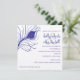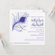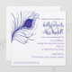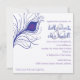 Cartão de convite quadrado com ilustração de pena de pavão. azul escuro com sotaque roxo.