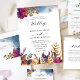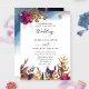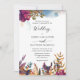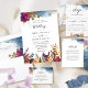 Convite elegante e único para o casamento, com a captivação de uma paisagem mística de jardim com folhagem, flores e pássaros em chamas e delicadas manchas aquáticas no topo, numa variedade de tons roxos, magenta, turquesa, azuis, marinhos e ouros amarelos. Detalhes da caligrafia escrita à mão. Voltar com manchas de aquarelas, seção de monograma com iniciais de casal cobertas por jardim com borda de aves. O mesmo design com manchas de aquarela na seção do meio também está disponível. Parte de nossa coleção "Jardim Místico" com vários produtos de coordenação disponíveis.