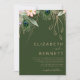 Penas de pavão escuro design de casamento com flores de coral, penas de pavão azul profundo e linhas botânicas cerâmicas sobre um fundo verde-escuro da floresta.