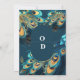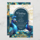 Convite para casamento de na moda moderno com pavões. Ouro azul verde e turquesa com linha dourada, escrita clássica, caligrafia elegante e minimalista (imitação do pó prateado e do ouro). Um belo e elegante convite de casamento, simples e moderno.