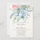 Este convite de casamento tendencioso mostra flores cor-de-rosa e azuis em um papel branco, com cor de água. Usamos arte de LABFcreations.