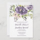 Peônias de aquarela em roxo, lavanda e verde com convites para casamentos de flores de sotaque creme. A parte de trás do cartão é roxo escuro. As caixas de texto são fáceis de personalizar com suas próprias informações. O texto é uma mistura de fontes modernas e ornamentados de caligrafia.
