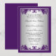 Um elegante design de pergaminho florescente aparece neste convite formal de casamento roxo e prata falsa. Designs são ilustrações impressas em formato plano - NÃO SILVER REAL