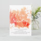 O convite de casamento para o pêssego de coral de cor abstrato moderna apresenta uma pintura de cor d'água pintada manualmente com textura em tons de laranja e pêssego de coral, folhas de maple em branco com veias de coral e texto em branco e cinza. Este convite para casamento elegante e na moda é um modelo perfeito para o seu primavera, verão ou outono/outono. Note que esta é apenas uma imagem de aquarela e não textura real. Para obter melhores resultados, escolha feltro ou outro papel.
