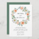 Convide convidados para o seu casamento em estilo com nossos convites de casamento Watercolor Peach & White Floral Wreath. Os convites florais de casamento exibem seus nomes cercados por uma coroa de pêssego, borrão e flores brancas de aquarela com folhas verdes e peludas com seus detalhes de casamento abaixo. O convite para o casamento floral de pêssego reverte para um fundo verde sólido. Perfeito para casamentos de primavera e jardim de verão!