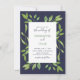 Este elegante e simples design apresenta caules e folhas pintadas manualmente com aquarela com texto clássico azul e verde sobre fundo azul. A cor do texto e a cor do plano de fundo podem ser facilmente alteradas para qualquer cor que corresponda ao seu evento. Um convite perfeito para um evento de temas botânicos, verdes, ao ar livre ou rústicos.