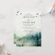 Um convite para o casamento de serraleira de pinheiros ruidosos. Soft, sereno e névoa etérea, com pássaros a voar acima. tipografia sorif elegante, e a paisagem da floresta de montanha continua no final do convite. Azuis eetéreos e verdes macios
