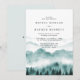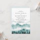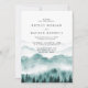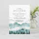Convite de casamento elegante e rústico com montanha em aquarela com árvores e iniciais da noiva e do noivo ao fundo.