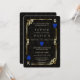 Casino Royale único, design de cartas temático art déco. Apresenta estilo art déco vintage, uma moldura quebrada antiga de Hollywood dos anos 20 com Fleur-de-lis em folha de ouro falsa, corações azuis, Q e K em dois cantos (simulando cartas de baralho), em fundo com padrão art déco preto dourado. São usadas expressões especiais como num jogo de pôquer. No verso, padrão art déco em ouro falso e iniciais entre os naipes das cartas de baralho. Use a ferramenta Personalizar para adicionar suas informações. Para mais, visite, por favor, minha Coleção de Cassinos.