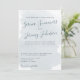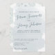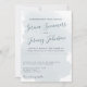 Na moda e convites modernos de casamento com uma simples tipografia sobre um pó azul de lavagem a aquarela. O design simples pode ser facilmente personalizado com seus detalhes de casamento. A parte traseira da placa apresenta um intricado impressão de noiva. Os artigos de papelaria e decoração de casamento podem ser encontrados na loja.
