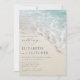 Perfeito para casamentos de destino, este elegante convite de casamento de praia de verão com um belo roteiro clássico de caligrafia mostra uma foto de proximidade de uma praia com uma onda oceânica e um mar.