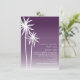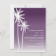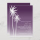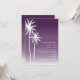 Um convite para o casamento na praia com uma ilustração de duas palmeiras brancas à esquerda sobre um fundo ombre roxo. Personalize o texto em branco.