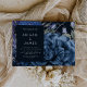 Este elegante e humilde convite para o casamento apresenta um design floral romântico e exuberante em azul marinho com folha de cor prateada e folhagem brilhante num fundo azul escuro. Personalize o texto da cinza prateada em fontes na moda num retângulo azul escuro. A parte traseira da placa é azul escuro sólido.