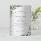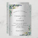 Fundo de aspecto fino prateado decorado com verde de eucalipto, folhagem de ouro e brilho verde e prata, faíscas. Personalize e adicione seus nomes e detalhes do casamento. Letras negras.
