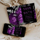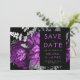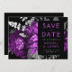Este elegante e melancólico casamento Salve o cartão de Data apresenta um buquê floral romântico e luxuoso em roxo de ameixa com folha de prata e folhagem brilhante num fundo preto. Personalize a cinza prateada e o texto da ameixa em fontes na moda num retângulo preto e adicione o URL do seu site de casamento ao fundo preto sólido.