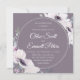Um convite de casamento elegante e moderno começa com um fundo roxo e suave. Um quadro de prata cintilante rodeia sua informação de celebração do casamento. Mal há anêmonas roxas leves com centros roxos profundos decoram dois cantos do convite quadrado. Folhas verdes e gemas aditam interesse floral adicional. Os nomes dos casais de casamento estão escritos em uma grande escritura decorativa. O resto do texto encontra-se numa combinação clássica de texto direito e itálico. O convite de casamento roxo e branco faz parte da coleção Blush Violet. Contém muitas modelos DIY que podem ser usadas para fazer uma bela suíte de papelaria de casamento.Você deve ver um link para ela nesta página. Se você não vir o link ou precisar de ajuda com um item, por favor, entre em contato comigo.