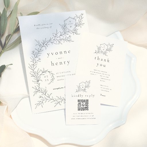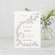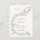 Um convite de casamento feito à mão com um desenho rústico de botânicos folhosos subindo o cartão. Há um galho que se enrola à volta da data, e no topo da carta, há uma crista de casamento aninhada na folhagem. A tipografia é preta e o fundo é creme. A ilustração floral é uma cinza ligeiramente mais leve para que o texto se destaque. Visualize a coleção vinculada nesta página para itens correspondentes ou visite nossa loja para mais convites de casamento.