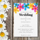 Estes convites de casamento fáceis de personalizar oferecem um estilo retrô moderno com flores de margarida hippie em amarelo brilhante, azul e cor-de-rosa fuchsia. Os gráficos desenhados à mão são projetados para imitar a impressão em estilo risógrafo clássico. Todo o texto sobre estes convites está pronto para o seu toque personalizado com uma simples impressão preta contra um fundo branco limpo.