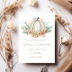 O convite de casamento costeiro, do tema do outono, apresenta uma abóbora de aquarela cercada por estrelas e conchas de areia, coral, palma e eucalipto em uma paleta colorida de outono.