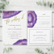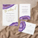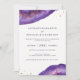 Estes elegantes e modernos convites de casamento apresentam pedras de geodo roxo com cor d'água, com escavações douradas falsas.