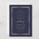 Convite de casamento Elegante, azul e marinho, com fonte moderna de escrita. Personalize facilmente este cartão de casamento minimalista com os seus detalhes de casamento, dentro de um quadro de ouro rosa.